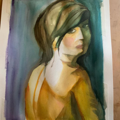 Ce portrait joue habilement sur la lumière et l’ombre pour capturer l’élégance de la figure. La posture, combinée à un regard discret mais direct, crée une tension émotionnelle subtile. Les teintes chaudes du sujet contrastent harmonieusement avec le fond sombre et froid, soulignant l’intimité de la scène.