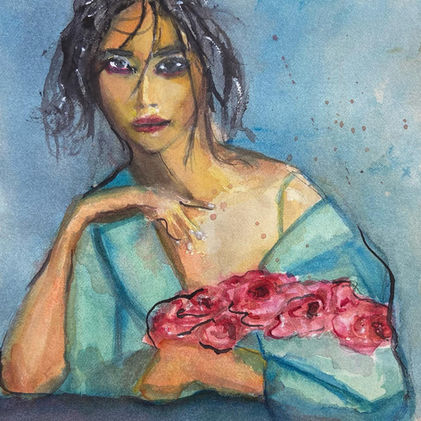 Un portrait féminin dans une posture élégante, tenant un bouquet de fleurs rouges. L’expression intrigante et le geste de la main apportent une touche narrative au tableau.