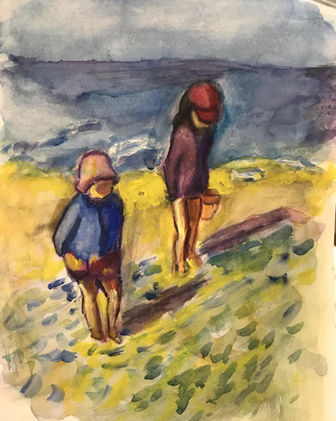 Cette œuvre capture un moment de quiétude en bord de mer, typique de l'enfance. Les couleurs douces et les formes floues traduisent une impression de rêve, où les souvenirs se mêlent à la réalité. L'utilisation de l'aquarelle ajoute une légèreté à la scène, évoquant la fraîcheur et la fluidité de l'air marin.