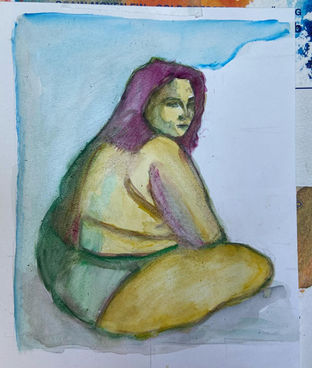 : Description principale du tableau Une femme nue, assise et vue de dos, jetant un regard par-dessus son épaule. Les cheveux violets contrastent avec les teintes naturelles de la peau.