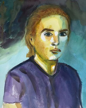 Ce tableau exprime une certaine mélancolie, capturant un moment de réflexion intérieure. Les contrastes dans la lumière et les ombres accentuent les contours et insufflent une sensation d'immédiateté au portrait. La technique de l'aquarelle est utilisée avec maîtrise, permettant à la fois de jouer sur la transparence et les couches de couleurs. Le fond abstrait renforce l'accent mis sur le visage du sujet, ajoutant une profondeur visuelle et émotionnelle à l'œuvre.