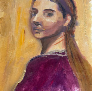 Cette œuvre dépeint une figure féminine en introspection, entourée d'une aura énigmatique. L'utilisation audacieuse de violet et de vert instaure une ambiance à la fois douce et intense, tandis que les formes presque éthérées des fleurs ajoutent une touche de mystère. Les détails minimalistes du visage contribuent à l’expressivité silencieuse du sujet.