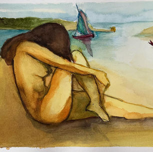 L’artiste crée ici une scène dynamique où la lumière et le mouvement sont les protagonistes principaux. Les personnages au premier plan apportent une touche narrative, renforçant l’impression d’une scène vivante et romantique. Le travail de l’aquarelle illustre la délicatesse et la spontanéité de l’instant capturé. Dix-neuvième tableau (Portrait de femme aux yeux fermés)