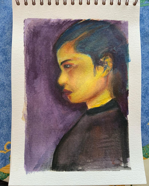Cette œuvre capte un instant de réflexion intime, où les couleurs vibrantes intensifient l'émotion latente du sujet. La technique de l'aquarelle confère une légèreté éthérée, permettant aux ombres de danser discrètement sur le visage, soulignant les traits avec une délicatesse tactile. L'utilisation du violet comme couleur dominante inspire une ambiance mystérieuse, tandis que les tons chauds apportent une touche de vie intérieure. L'ensemble crée une symphonie visuelle entre tranquillité et intensité émotionnelle.