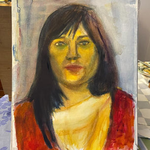 Ce portrait masculin se distingue par son sérieux et son intensité émotionnelle. L’artiste parvient à capturer une expression intérieure forte, tout en exploitant les contrastes entre couleurs chaudes et froides. Le fond, volontairement flou, semble entourer le sujet d’une aura méditative, renforçant l’idée de solitude ou d’introspection. La technique de l’aquarelle est bien maîtrisée, offrant un mélange subtil de précision et de légèreté, notamment dans le rendu des traits du visage. Ce tableau invite à imaginer l’histoire intérieure de ce personnage. Analyse du troisième tableau (femme nue dans un paysage)