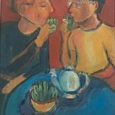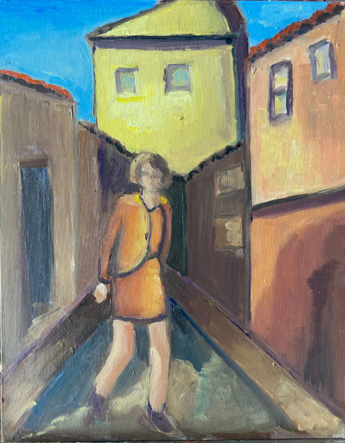 Cette œuvre capture un moment simple de la vie quotidienne dans une ruelle urbaine. L'utilisation de couleurs chaudes et la lumière éclatante du soleil transmettent une chaleur tangible, contrebalancée par l'expression introspective de la figure solitaire, évoquant un sentiment de contemplation personnelle au sein de la ville vibrante.