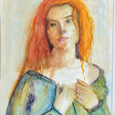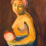 Ce tableau explore la relation entre la figure humaine et son environnement abstrait. Le choix des couleurs audacieuses, combiné à une simplification des traits, exprime une intériorité riche, presque mystérieuse. La femme semble absorbée dans une pensée ou une émotion que le spectateur ne peut que deviner. L’arrière-plan tourbillonnant contraste avec la sérénité apparente du sujet, créant un dialogue visuel captivant. Analyse détaillée du sixième tableau (trois femmes, fond jaune/orange)