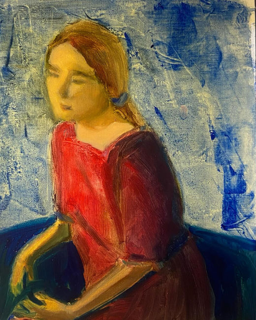 Ce tableau évoque un moment suspendu dans le temps, où la figure féminine semble plongée dans ses pensées. Le contraste entre les couleurs chaudes et froides intensifie cette sensation d’introspection. Le traitement de la matière et l’aspect légèrement flou du visage renforcent une impression de douceur et de mystère. L’artiste joue avec la lumière et les ombres pour donner de la profondeur et une certaine tension émotionnelle à la scène. L’influence de l’Expressionnisme est notable dans la manière dont l’émotion prime sur la précision des détails. Ce tableau, bien que simple en apparence, révèle une richesse émotionnelle subtile.