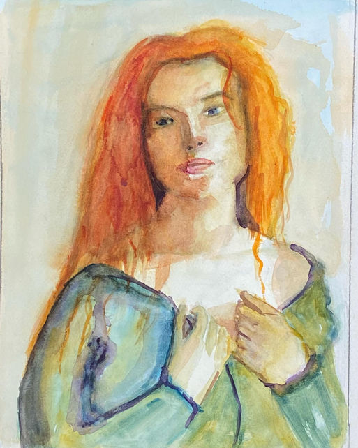 Cette aquarelle capture avec subtilité la personnalité du sujet. Le choix des couleurs met en valeur une tension entre la chaleur des cheveux et la douceur plus froide de la tenue. L’artiste joue sur la lumière pour créer un portrait vibrant et humain, tout en laissant des zones volontairement floues pour inviter l’imagination du spectateur. Le regard mélancolique et le geste des mains renforcent l’impression d’un moment intime, presque introspectif. L’œuvre démontre une maîtrise de l’aquarelle et une capacité à exprimer une émotion contenue.